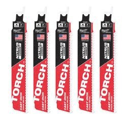 The Milwaukee® 6 in 7 TPI The TORCH™ with NITRUS CARBIDE™ for cast iron and other thick metals is the next generation of carbide teeth technology. This SAWZALL® blade with NITRUS CARBIDE™ teeth cuts longer, cuts more and cuts faster than traditional carbide teeth products on the market. Milwaukee® NITRUS CARBIDE™ technology eliminates the trade-off between life and speed of cut compared to traditional carbide teeth blades. The blade delivers 3X the life of existing carbide teeth reciprocating saw blades to continuously make the toughest cast iron removals on the job. With 25% more NITRUS CARBIDE™ per tooth and a 1/2 in universal tang, The TORCH™ SAWZALL® blade with NITRUS CARBIDE™ cuts the thickest metals like cast iron and soil pipe. With a unique carbide blend, it also outperforms standard carbide teeth blades in common thick metals.